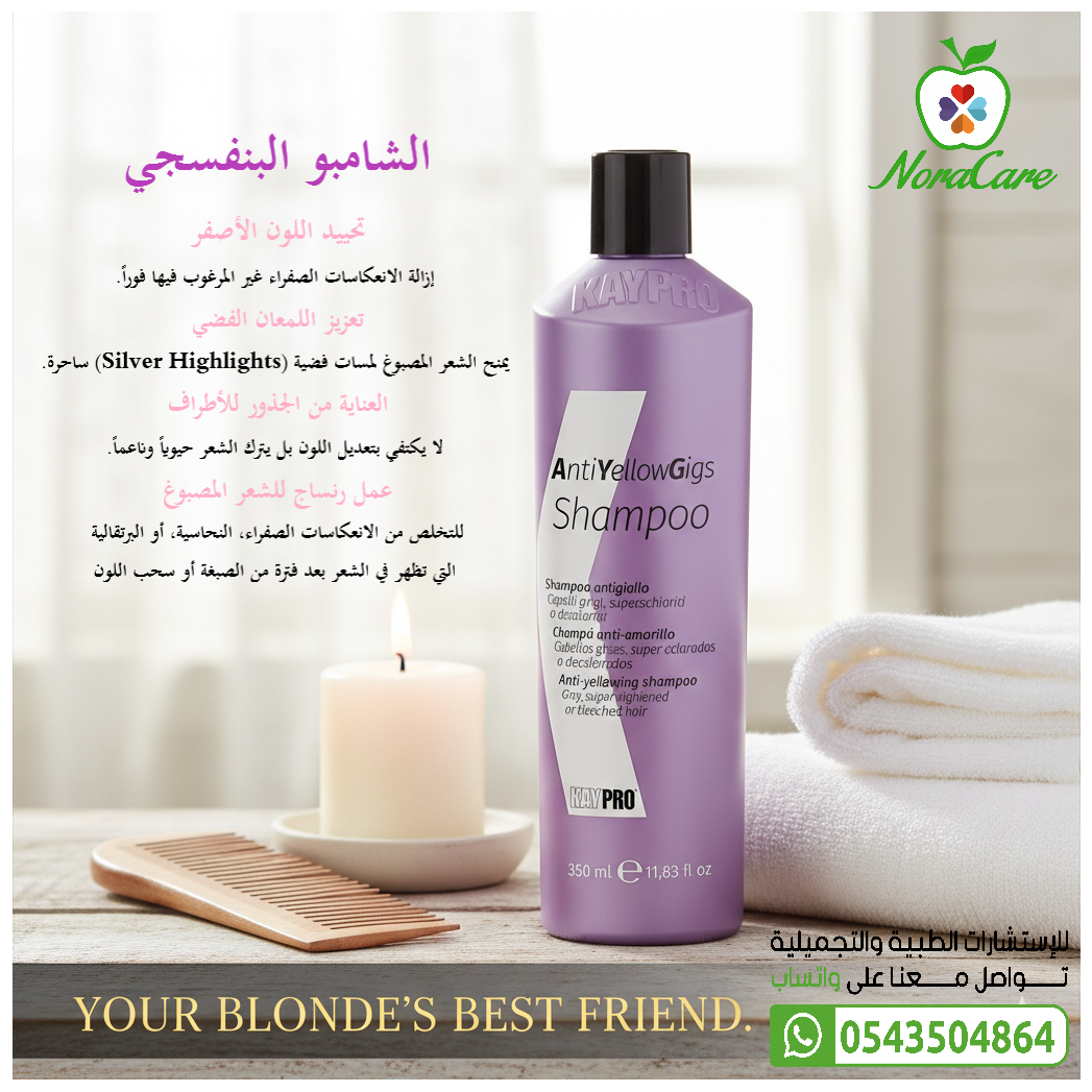 الشامبو البنفسجي (مثل KayPro): مخصص للشعر الأشقر الفاتح جداً، والبلاتيني، والرمادي، للقضاء على اللون الأصفر.