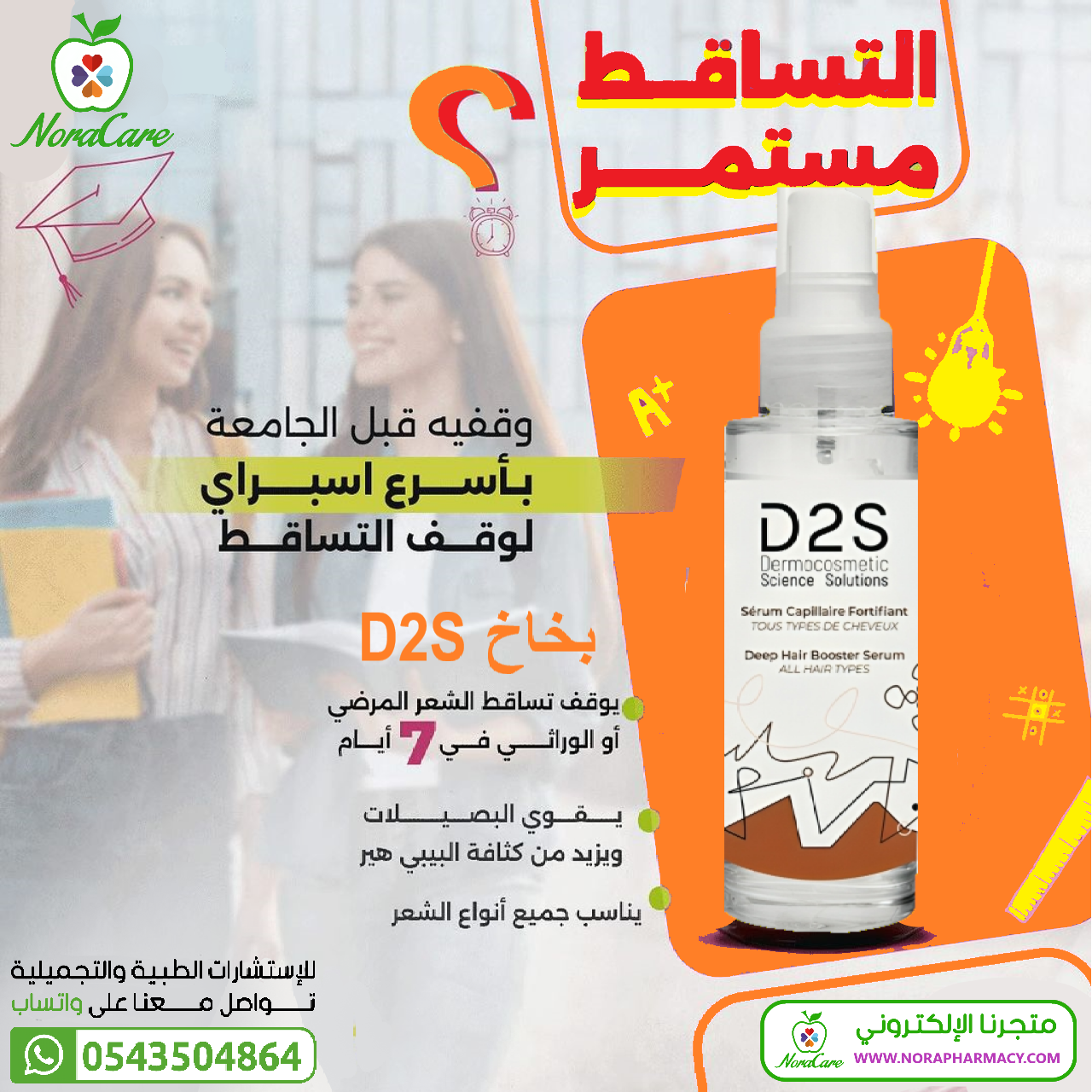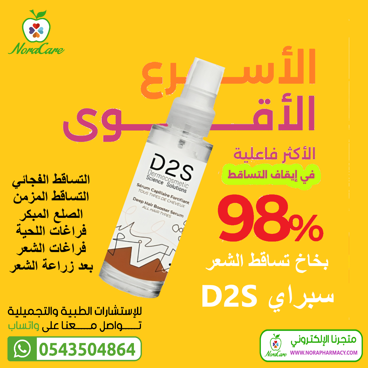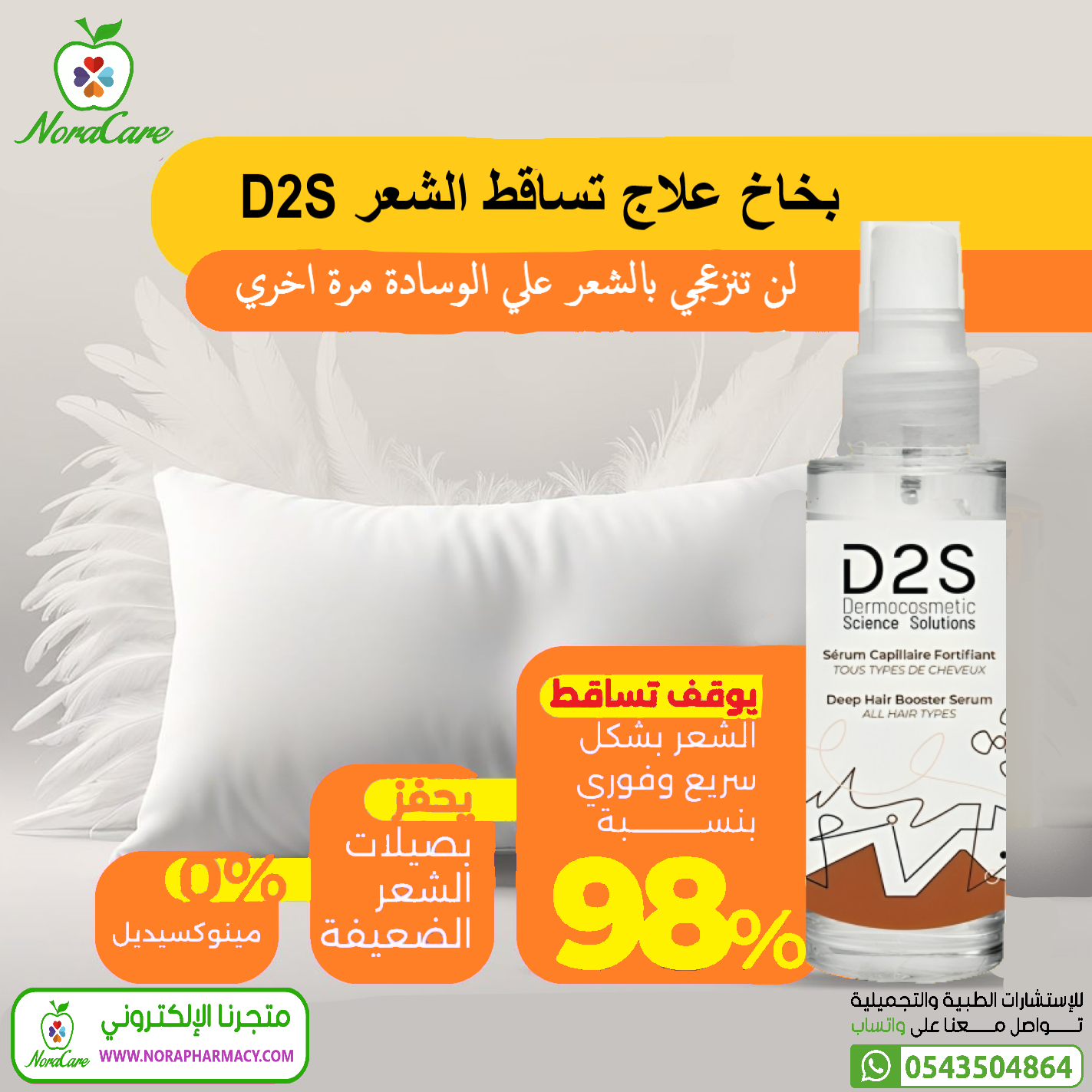 سيروم D2S هو خيار فعال لعلاج تساقط الشعر وتعزيز نموه. تركيبته الطبيعية وسهولة استخدامه تجعله مناسبًا للجميع.