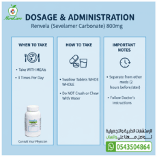 تختلف الجرعة الموصى بها حسب مستوى الفوسفات في الدم واحتياجات المريض الفردية. عادة ما يتم تناول RENVELA مع وجبات الطعام. يوصى بتناول الأقراص كاملة دون سحقها أو مضغها. يجب أن يتم تحديد الجرعة من قبل الطبيب المعالج فقط، وقد يتم تعديلها بناءً على المراقبة الدورية لمستويات الفوسفات في الدم.
