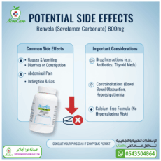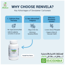 أحد الفوائد الهامة لـ RENVELA هو أنه لا يحتوي على الكالسيوم، على عكس بعض عوامل ربط الفوسفات الأخرى. هذا يمنع خطر فرط كالسيوم الدم (Hypercalcemia)، وهي حالة يمكن أن تؤدي إلى تكلس الأوعية الدموية والأنسجة اللينة.