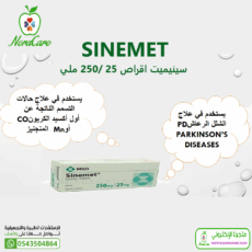 SINEMET سينيميت اقراص 25 /250 ملي هو دواء يُصرف بوصفة طبية، يُستخدم بشكل رئيسي لعلاج مرض باركنسون.