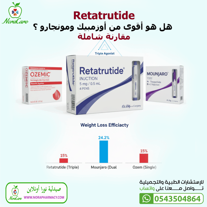 الميزة | الريتاتروتايد (Retatrutide) | المونجارو (Tirzepatide – Zepbound) | الأوزمبيك (Semaglutide – Wegovy) |